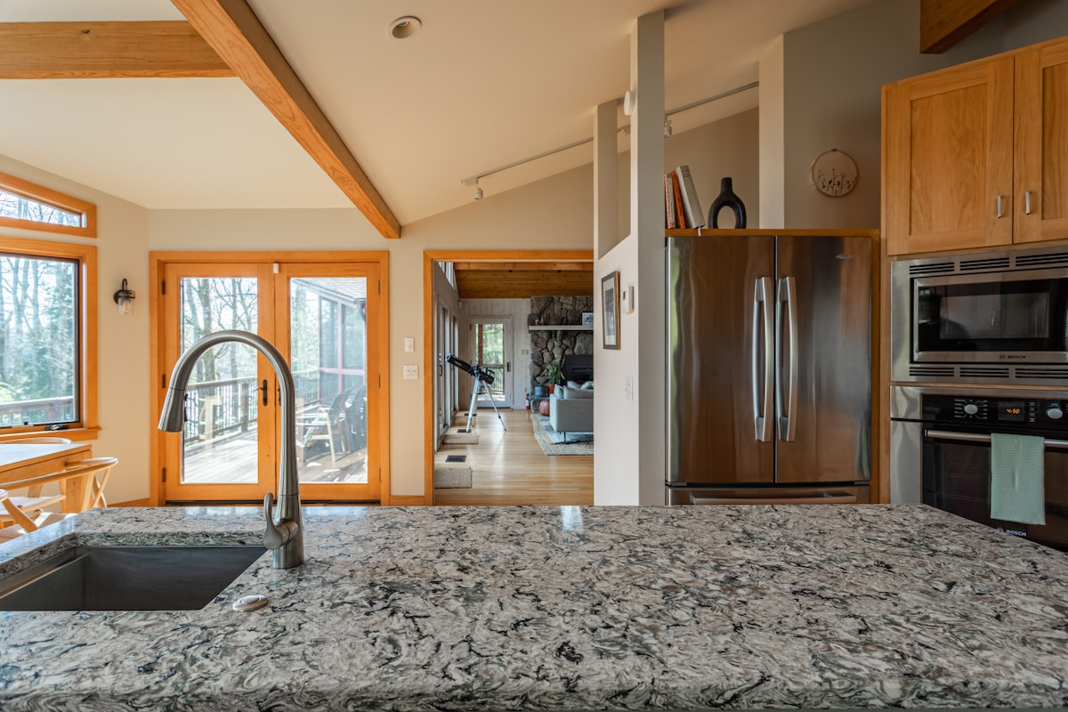 Proche de plusieurs stations de ski et entourée de montagnes et de 5 hectares de pelouse et de bois, notre maison est un moment de détente garanti. La faune vous accueille pendant que le soleil se lève sur la montagne. Profitez d'un barbecue au gaz ou au-dessus des charbons dans la cuisine extérieure. Allumez un feu à l'extérieur sur la terrasse et regardez le coucher du soleil. Jouez un trou de maïs ou traînez sur notre vaste pelouse. Antiquité en ville , piscine d'été gratuite, ski et randonnée, ainsi que de nombreuses autres destinations, à chaque saison.
