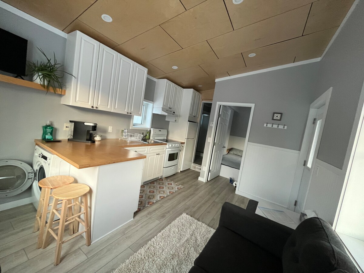Micro studio moderne et privé au centre-ville de Dawson City. Comprend un lit queen size, une douche à l'italienne, une cuisine équipée, un lave-linge/sèche-linge dans la suite et une entrée privée. Il n'y a pas de chambre séparée. Chaque séjour comprend une carte cadeau de 20 $ au Riverwest Bistro, un café local populaire. Emplacement central, calme et accessible à pied, à proximité des magasins, des restaurants et de la rivière Yukon. Idéal pour les voyageurs en solo ou les couples à la recherche de confort, de simplicité et de commodité. Notez que cette suite est équipée du wifi, mais pas de télévision.