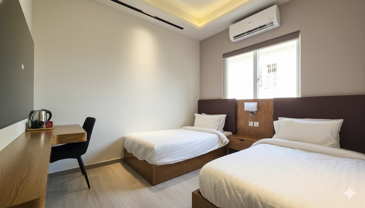 Nous sommes situés au cœur de la ville, à quelques pas de tout ce que la meilleure ville a à offrir. Nous prenons l'hygiène et la propreté en particulier, avec des normes strictes en place. Notre chambre dispose d'une literie confortable et d'une gamme d'équipements tels que téléviseurs intelligents, Internet haut débit, climatisation et bien plus encore. Ce qui nous distingue vraiment, c'est notre service personnalisé. Notre personnel est dédié à fournir le plus haut niveau d'hospitalité parce que nous croyons que les petites touches font toute la différence.