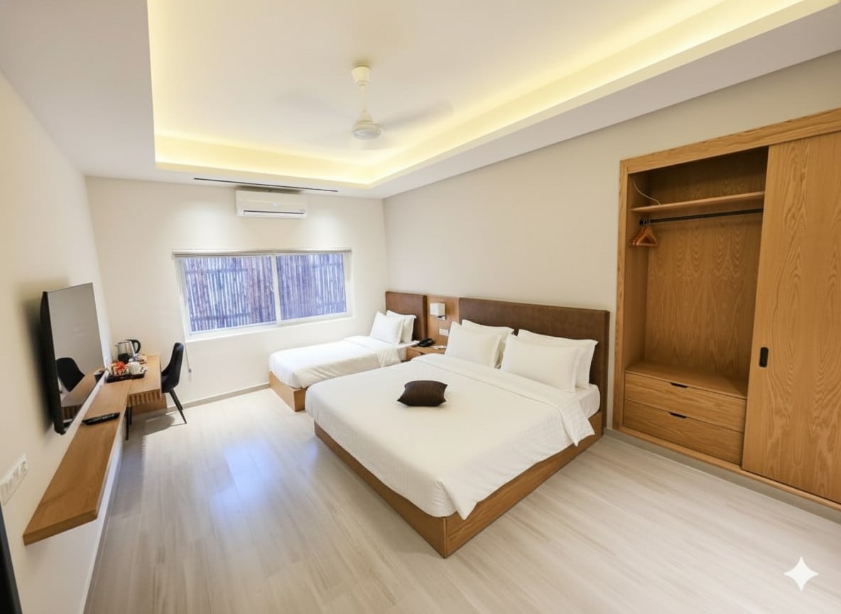Cette chambre confortable avec lit double est idéale pour 2 à 3 personnes, offrant tout le nécessaire pour un séjour relaxant à l'hôtel 24h/24. Commodités de l'hôtel : Accès à la salle de sport 24h/24 Service en chambre Hébergement sécurisé Lieux gastronomiques, salons de coiffure, marts et hôpitaux à proximité Petit déjeuner disponible pour 1 000 roupies pour 2 personnes Matelas supplémentaires disponibles (en supplément) Règlement intérieur : Interdit de fumer Les couples non mariés ne sont pas autorisés Pas d'alcool Profitez de votre séjour au cœur de la ville avec tout ce dont vous avez besoin à quelques pas !