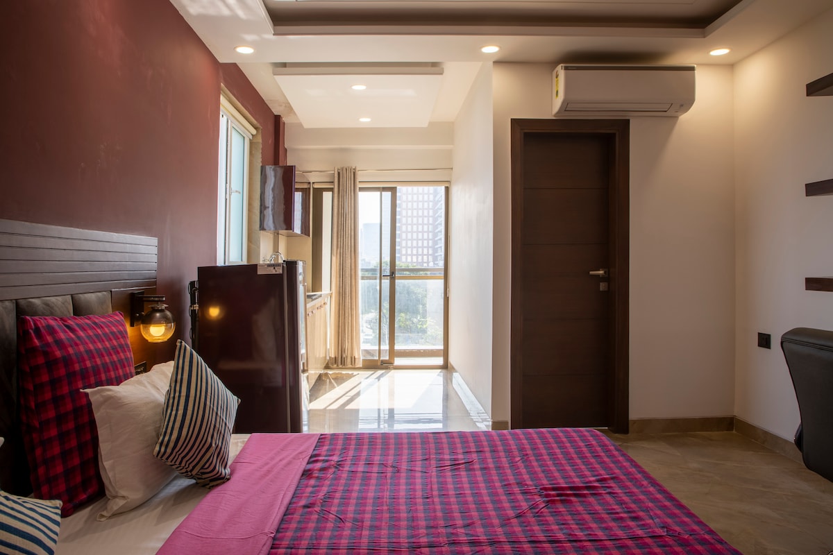 Géré par Perch Service Apartments. L'hospitalité la mieux notée nous a aidés à gagner le cœur de nos voyageurs et de plusieurs récompenses depuis 2011. • Studio de taille moyenne avec balcon • Cuisine entièrement équipée (plaque de cuisson, ustensiles, couverts, réfrigérateur, micro-ondes, etc.) • Cuisine centrale, commande de chambres et salon pour le petit déjeuner • Déjeuner disponible à 295 Rs + TPS par personne. • Salle de sport et salon avec grande télévision intelligente • À 5 min à pied du centre commercial Ambiance Mall & DLF Cyber City • À 500 mètres de la station de métro Moulsari Ave