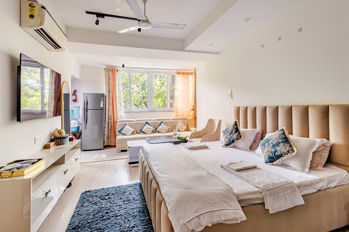 Welcome to The Peacock Nest: a tranquil, ground-floor 3BHK (2500 sq ft) in South Delhi’s lush Saket. Just 5 mins from the Metro, PVR Saket, and premier malls (Select Citywalk & DLF Avenue). Each bedroom features a king/queen bed, ensuite bath, Smart TV, AC/heating, air purifier & premium linen. Enjoy bright, art-filled interiors, a full kitchen, and your own private garden - an elegant retreat blending comfort, calm, and convenience.