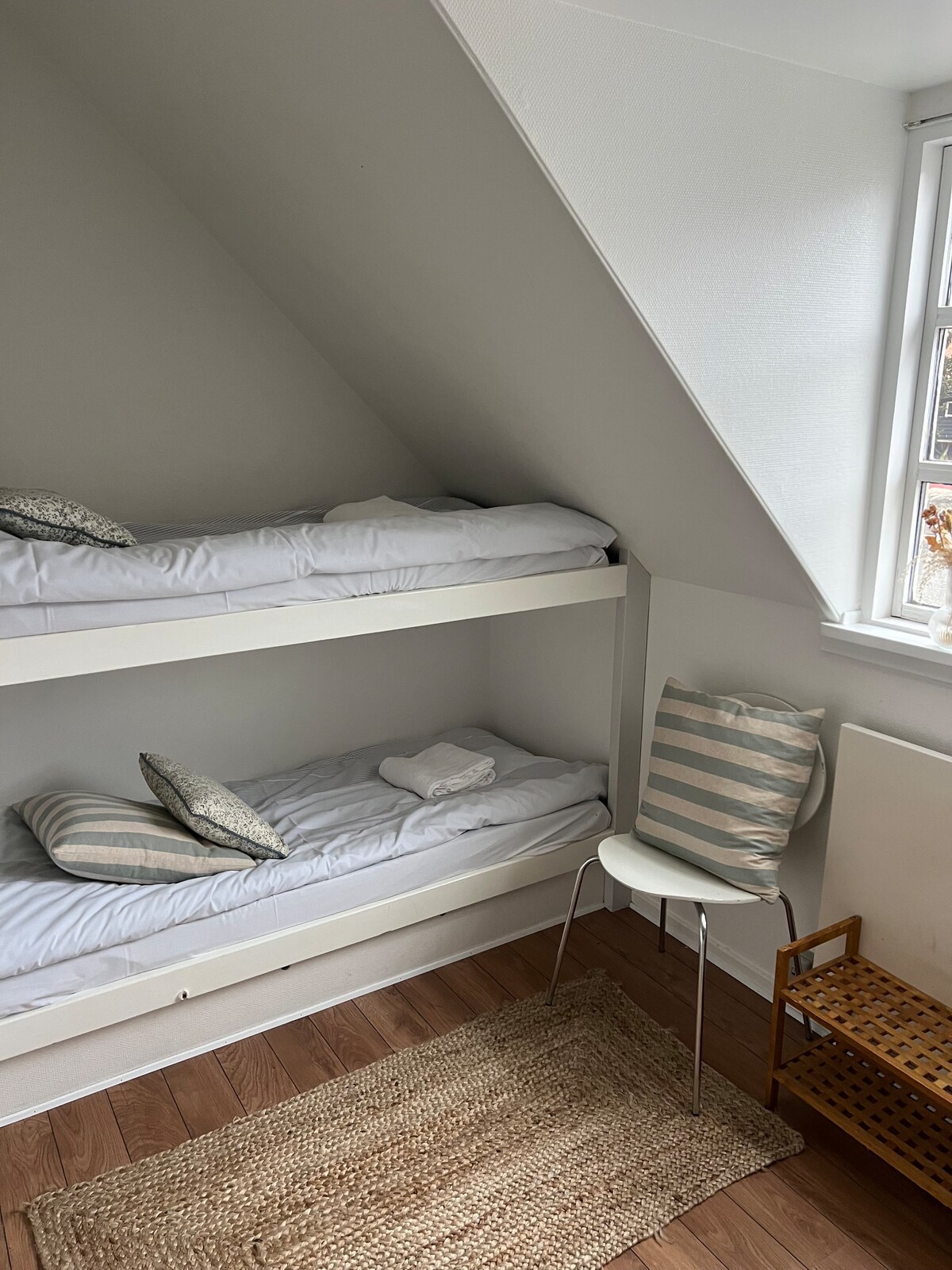 La chambre dispose d'un lit double et de 2 lits superposés. Les toilettes et la baignoire sont partagées dans le couloir et le lavabo dans la chambre. L'emplacement au 1er étage. La chambre dispose d'un accès à une cuisine partagée, à un salon et à la cour derrière l'auberge de jeunesse Gudhjem. Le prix comprend le linge de lit et les serviettes. Le petit-déjeuner peut être acheté dans l'un des cafés de la ville ou vous pouvez le préparer vous-même dans notre cuisine commune :)