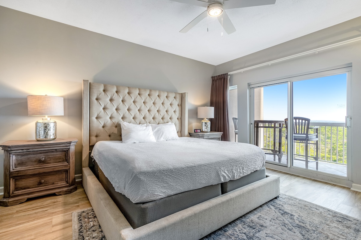 Appartement spacieux au 16e étage du Pelican Beach Resort avec une vue panoramique sur le golfe et un aménagement lumineux ouvert. Comprend une cuisine améliorée, une chambre king size avec salle de bain attenante, une deuxième salle de bain complète et des lits superposés dans le couloir avec une télévision individuelle. Profitez de superbes couchers de soleil et d'observations de dauphins depuis le balcon. Comprend une connexion Wi-Fi haut débit, Netflix sur chaque télévision et des chaises de plage avec parasol rangé dans le logement. Une escapade côtière au rez-de-chaussée parfaite !