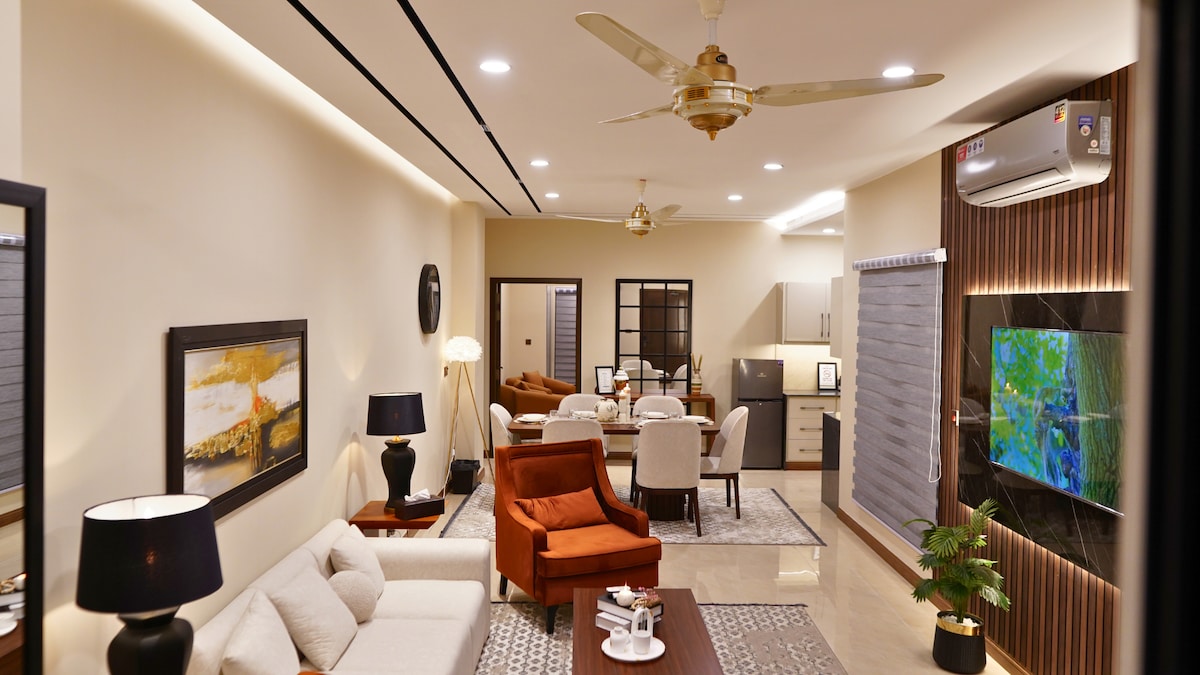 Luxury 2BHK in Zeta Mall | Giga Mall & Margalla Views - Spacious 1725 sq ft 2-bedroom condo with two king beds and a private balcony with outdoor seating. - 55" Smart TV and 30 Mbps Wi-Fi for work or streaming. - Fully equipped kitchen, inverter ACs, hot water and modern décor for a seamless stay. - Located above Zeta Mall Food Court, steps from Giga Mall, minutes to DHA and the Expressway. - Perfect for families and business travelers. - CNIC required 18+. No smoking or parties. Book Now!