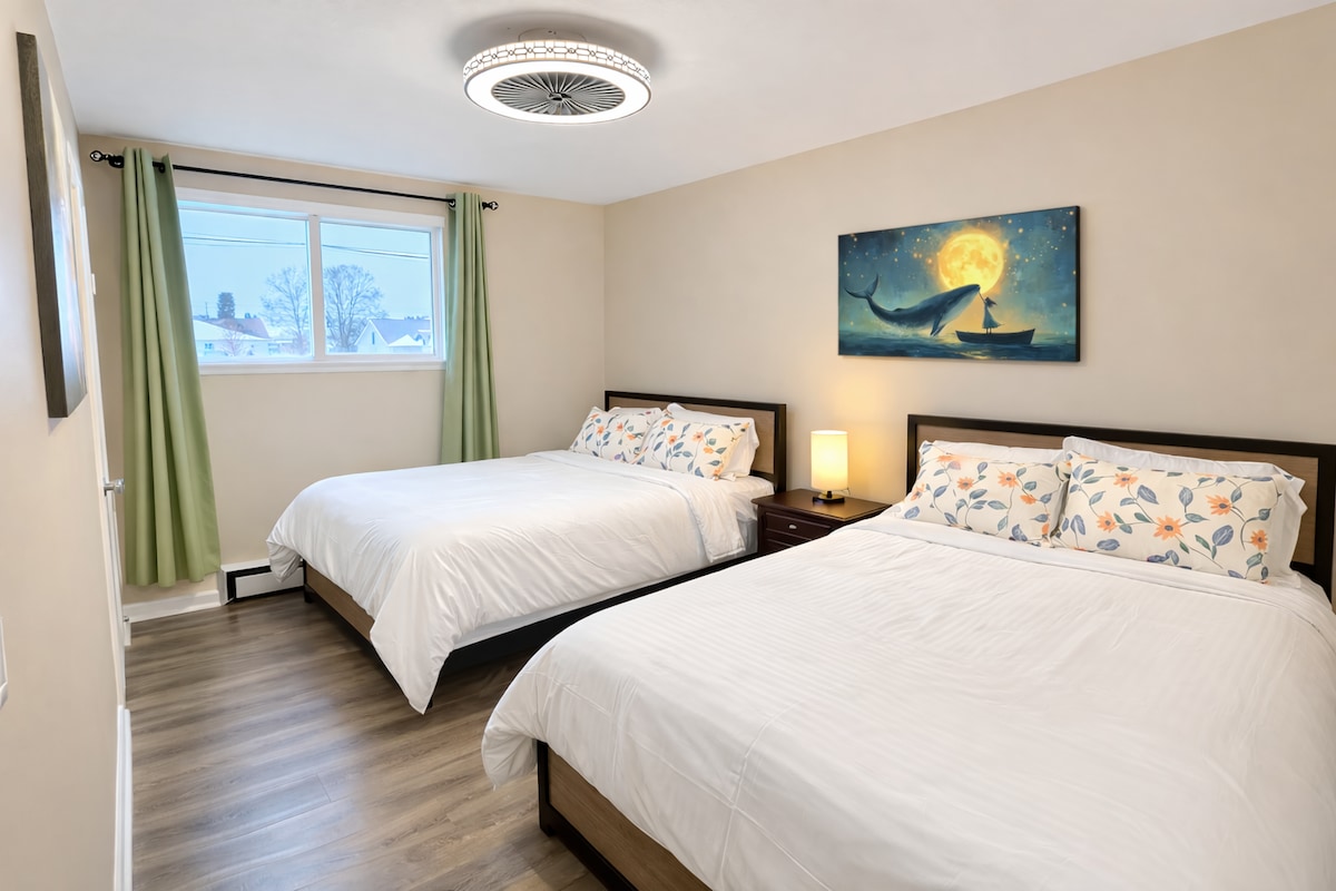 Bienvenue dans notre confortable logement Airbnb non-fumeur dans le quartier nord de Moncton! C'est un espace confortable équipé de tout le nécessaire pour un séjour relaxant. Que vous voyagiez pour affaires ou pour les loisirs, vous vous sentez comme chez vous dans cet appartement familial. À proximité/emplacements À 7 minutes en voiture de Magnetic Hill, Magic Mountain Splashzone. 5 minutes en voiture du Casino. À 6 minutes en voiture de l'Université Crandall À 10 minutes en voiture du Colisée 200 m du sentier pédestre Bon séjour ! lors de cette escapade unique et tranquille.