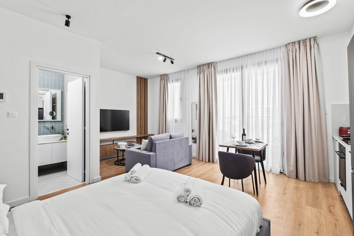 Tout mon appartement, se compose de : 1 séjour, 1 chambre, 1 salle de bain, 1 cuisine ; 1 balcon avant, idéal pour les couples, les aventuriers en solo, les voyageurs d'affaires. Les enfants de plus de 12 ans séjournent gratuitement. Accès : ascenseur et escaliers, pour les voyageurs à mobilité réduite. L'appartement fait 55 m². Vitesse Internet 150 Mbps. Petit déjeuner disponible dans des cafés de bon rapport qualité-prix à proximité et à 4 minutes à pied de la mer Méditerranée. Restaurants, vie nocturne et supérette à proximité. Départ : 12h00 - Arrivée : 15h00.