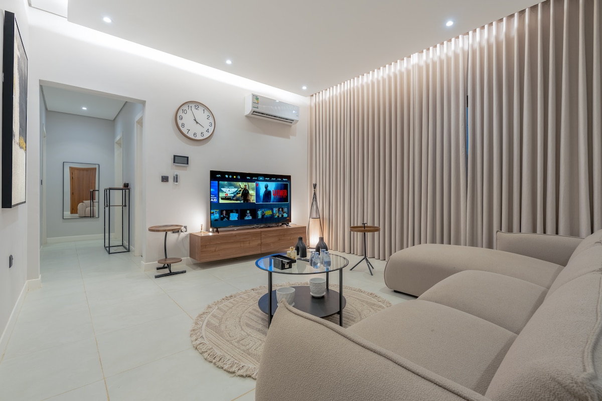 Séjour moderne, 1 chambre, 70 TV intelligente |305 buanderie