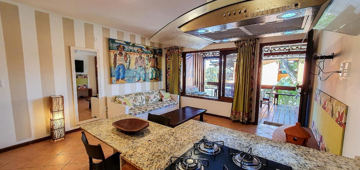 Aconchegante apartamento completo para 2/3 hospedes, em lindo e tranquilo condomínio fechado, muito bem localizado no centro de Arraial d'Ajuda bem próximo a vários tipos de comércios e a charmosa rua do Mucugê (5 min a pe), e possível deixar o carro no estacionamento e sair andando tanto durante o dia que a noite!!! O condomínio e construído sobre uma área em desnível, por tanto tem uma escadaria ao longo do caminho que leva até o apartamento (não recomendado para idosos).