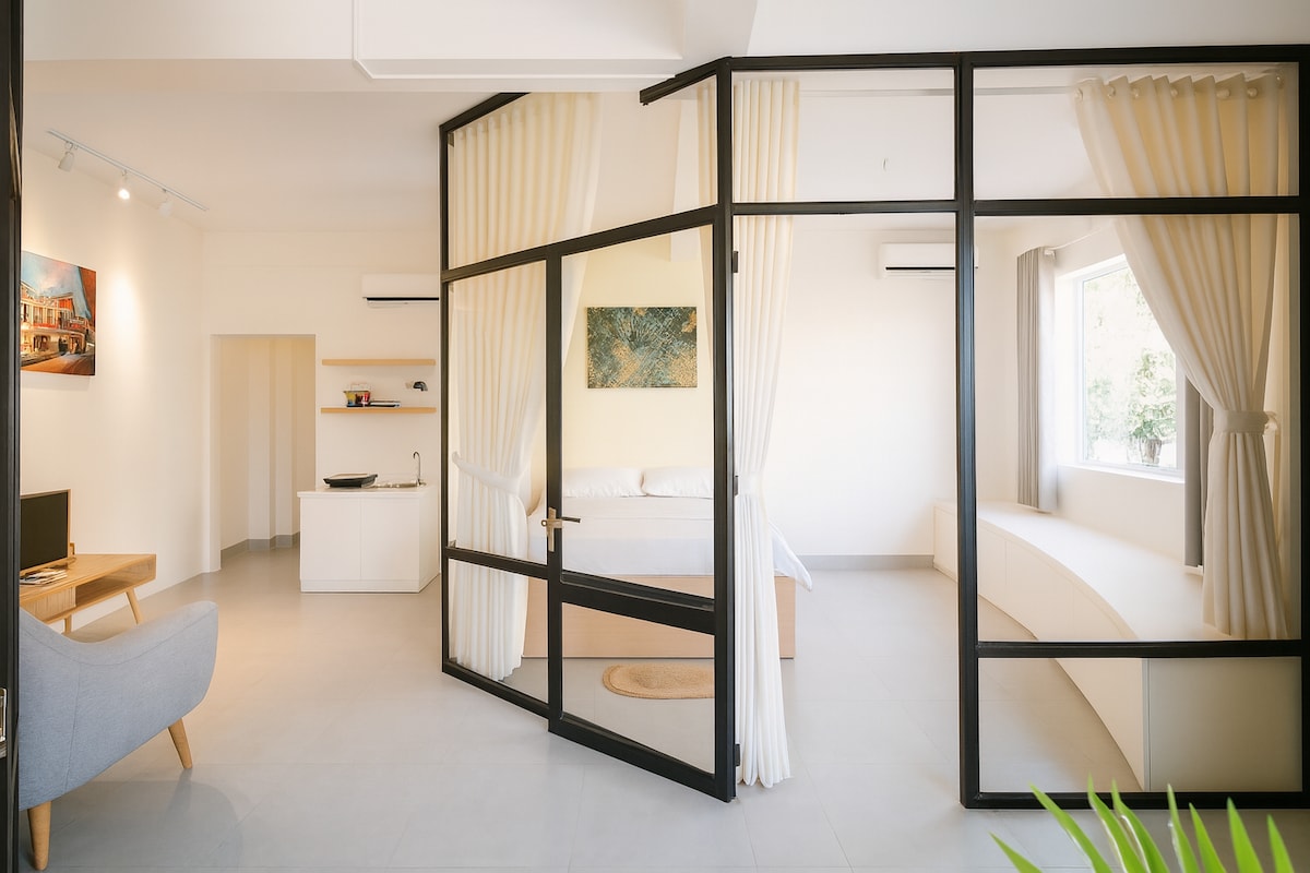 Studio 】de luxe【 urbain dans le quartier des affaires de Hô Chi Minh-Ville | 45 ㎡ Vue panoramique | Centre de vie à 5 minutes 🏙️ Points forts : • Emplacement privilégié : 2 min à pied des cafés/restaurants/épiceries, 5 min du supermarché, 600 m de l'église rose • Salon haut de gamme : fenêtres du sol au plafond, téléviseur Samsung Frame, matelas Emma, serrure intelligente et sécurité 24 h/24, 7 j/7. • Prêt pour le travail : fibre 200 Mbps, espace de travail de 1,5 m • Avantages : stationnement gratuit pour les motos + nettoyage toutes les deux semaines (séjour longue durée uniquement) Arrivée 🔑 intelligente : accès à distance via l'appli + boîte à clés