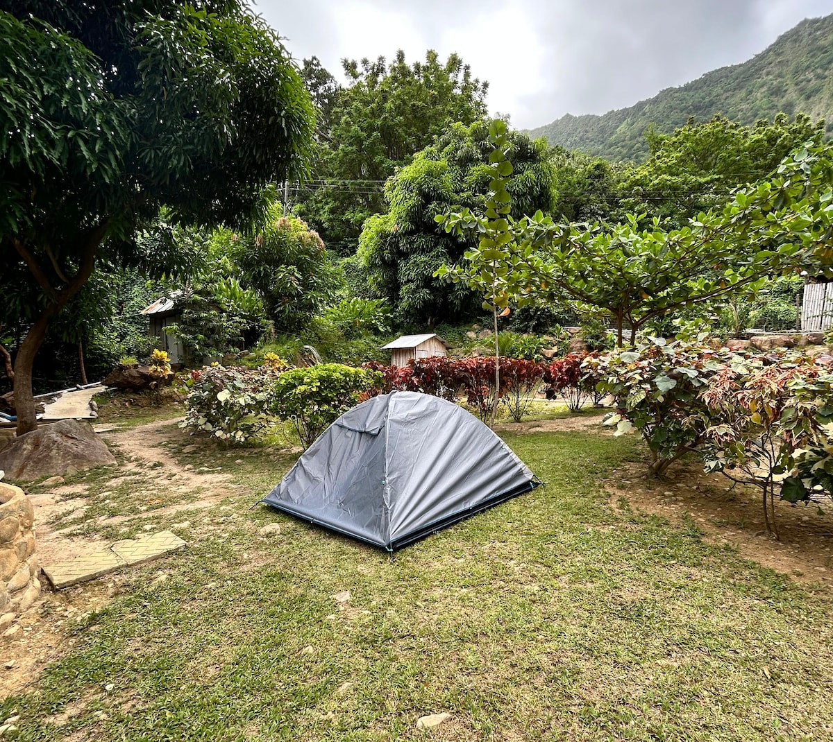 Un espace simple et ouvert niché dans la forêt tropicale, où vous serez en paix mais vivant avec les sons des oiseaux, des feuilles bruissantes et des brises fluides. Le terrain de camping se trouve devant notre maison, entouré d'arbres et de vues sur la montagne. C'est l'endroit idéal pour planter une tente, profiter de repas en plein air et se détendre dans le calme de la nature. Les voyageurs ont accès à de l'eau douce, à des sentiers de randonnée et à une salle de bain extérieure rustique, ce qui en fait un séjour confortable, mais simple. Disponible. - 3 tentes - 3 espaces de couchage
