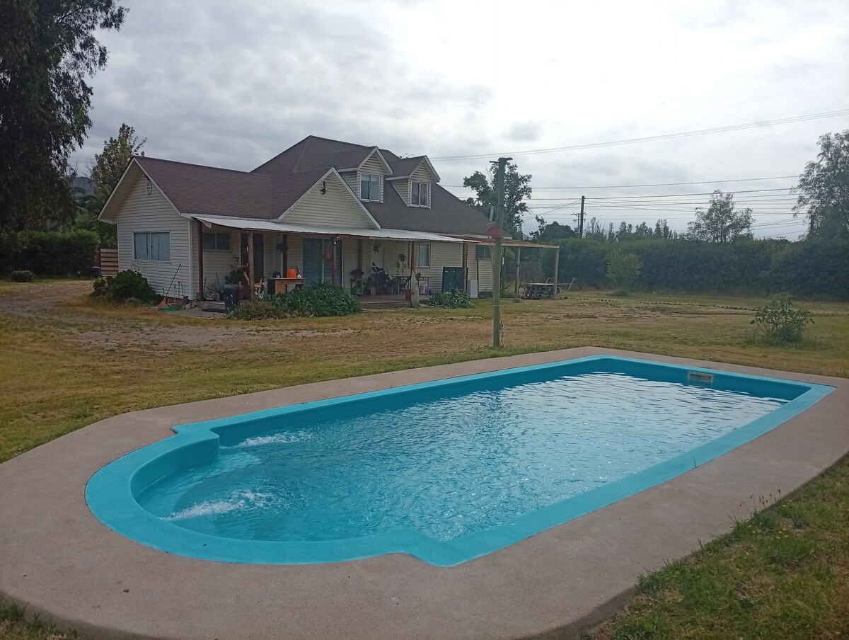 Cabane et piscine à usage exclusif, village calme El Ingenio, à 18 km de la Plaza San José de Maipo. Maison 65 m2, terrain 500 m2. Capacité 6 personnes, 2 chambres, 2 salles de bains, 1 lit double, 1 lit gigogne et 1 lit superposé. Il y a des draps et des serviettes, une cuisine équipée, du bois de chauffage, une piscine de 3,5 x 5 m x 1,30 m. Site clôturé, 2 ANIMAUX acceptés. MUSIQUE INTERDITE DANS LE JARDIN. Min. 2 nuits. Arrivée en bus, en voiture, à vélo, sur route goudronnée. Il y a le Wifi, des magasins. Vue sur la cordillère.