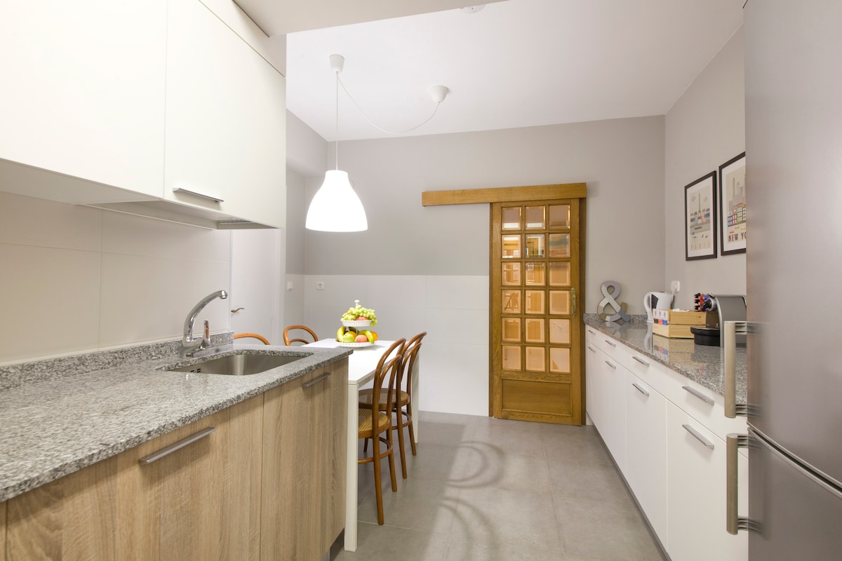 Appartement confortable avec place de parking privée incluse. Très bien relié, il est à 15 minutes à pied du centre et à 5 minutes en bus. L'appartement est confortable et spacieux, il dispose de 3 chambres, 2 salles de bains, salon, salle à manger, cuisine et une petite terrasse. La cuisine est entièrement équipée avec réfrigérateur, lave-linge, lave-vaisselle, plaque vitrocéramique, micro-ondes et four. Il dispose également du Wifi. Idéal pour les familles, les groupes d'amis et les personnes désireuses de profiter de notre belle ville.