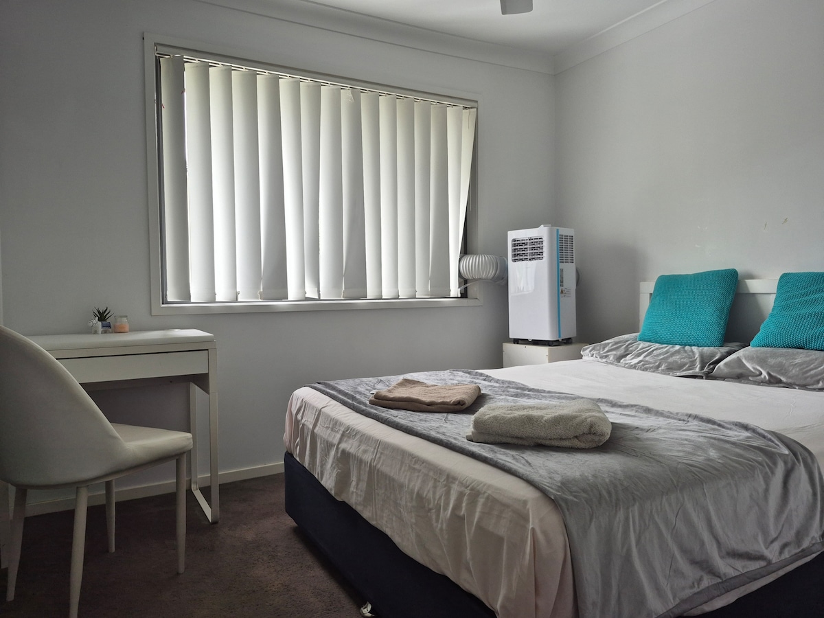 STUDIO & AMENITIES Access: Private gated entry & parking Living Space: Self-contained studio featuring Queen bed, AC & ensuite. Outdoor: Includes Private deck. KITCHEN Appliances: Fridge, microwave, air fryer, kettle, toaster. Supplies: Full set of cookware, tableware. LOCATION Setting: Quiet residential area near parks, bus stops. Proximity: 2 mins to local dining/ shopping; 15 mins Garden City Westfield Mall. Travel: Easy motorway access -25 mins Brisbane CBD; 35 mins Gold Coast THEME PARKS.
