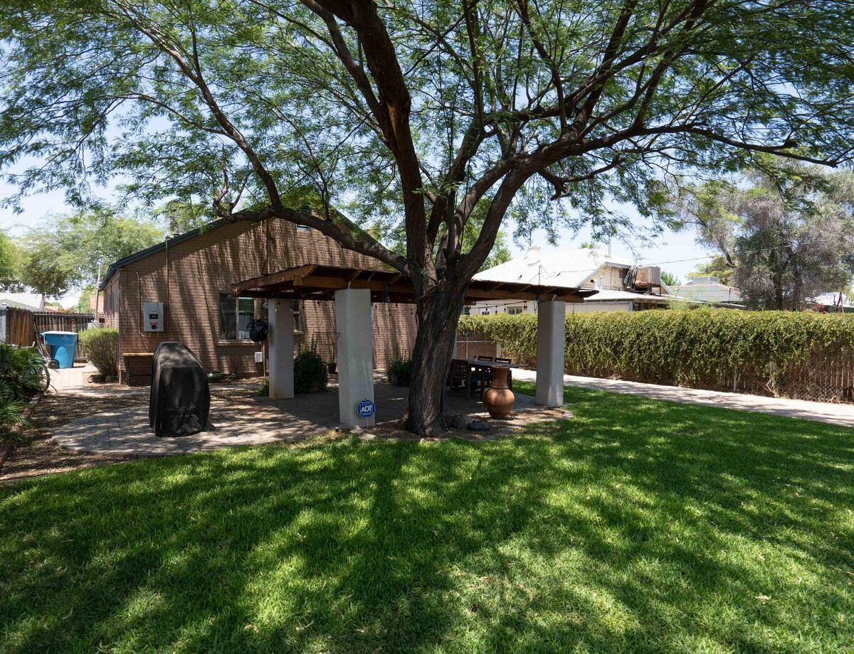 Bungalow de 2 chambres à proximité de tout ce que le centre-ville a à offrir ! Juste à côté de l'échangeur principal de l'autoroute de Phoenix et à seulement 7 minutes en voiture de l'aéroport. À quelques pas du train léger et accès facile aux vélos et aux scooters. Chaque chambre dispose d'une télévision Roku. Grands restaurants accessibles à pied et cuisine entièrement équipée avec ustensiles de cuisine pour manger sur place, avec épiceries à quelques minutes seulement. L'espace arrière-cour comprend un gril/fumeur au charbon de bois.