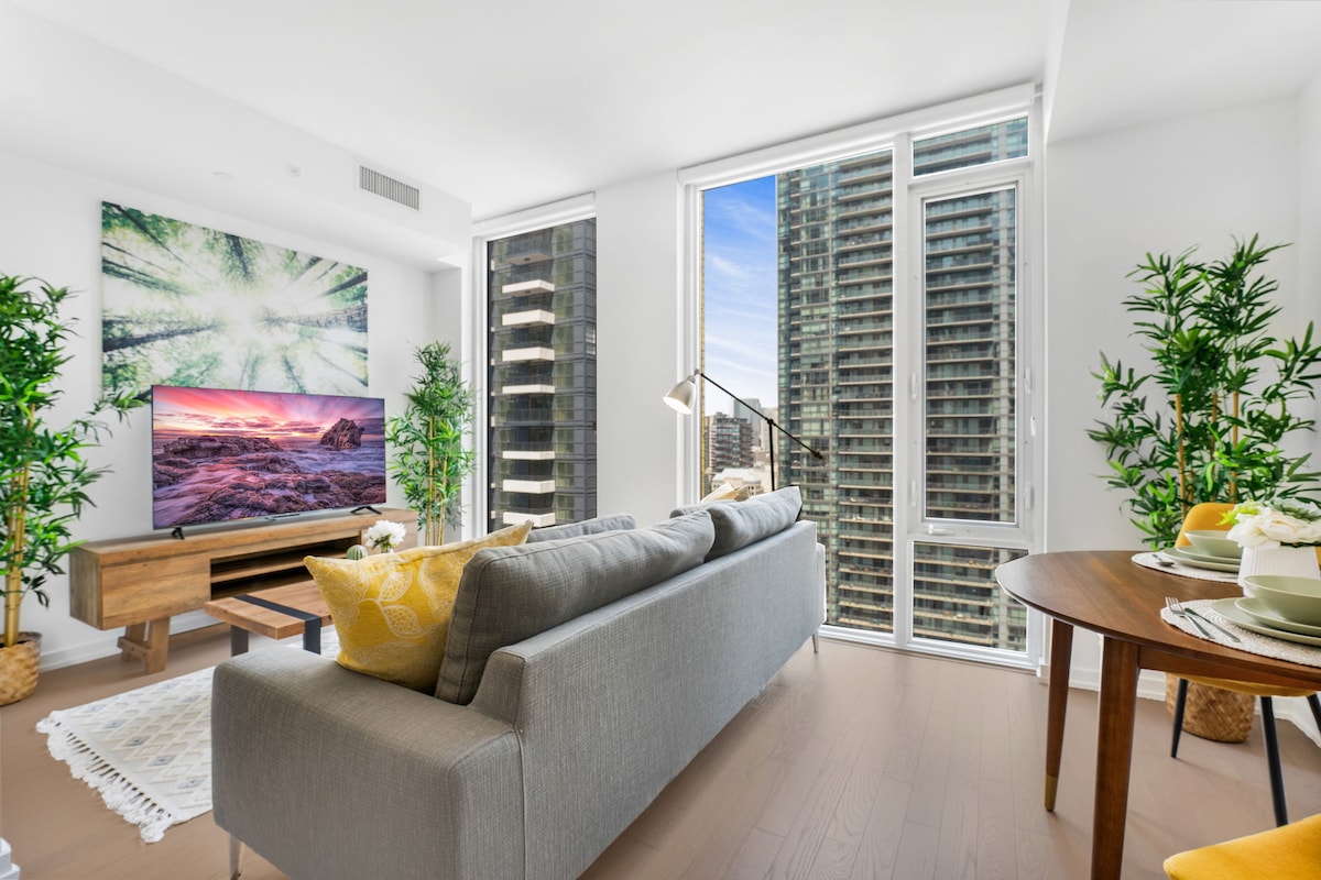 Bienvenue dans votre luxueux refuge d'une chambre à coucher au cœur du centre-ville de Toronto! À quelques pas de Bay & College Ce que vous allez adorer : • Étage élevé avec vue sur la ville • Plafonds très hauts et fenêtres pleine hauteur • Espace lumineux et aéré avec beaucoup de lumière naturelle. • Cuisine entièrement équipée et buanderie dans l'unité • Wi-Fi haut débit et télévision intelligente • Walk Score 99 - métro, U de T, Eaton, restaurant à quelques minutes Parfait pour les couples ou les voyageurs en solo qui veulent un confort haut de gamme dans un emplacement privilégié.
