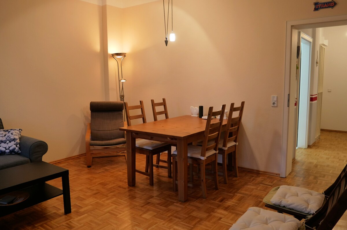 C'est notre petit appartement calme de 2 pièces au cœur de la nouvelle ville de Dresde. L'appartement est situé dans l'arrière-boutique d'un immeuble d'appartements au 3ème étage, il se compose d'une cuisine entièrement équipée, salle de bains avec baignoire douche, salon avec télévision et canapé-lit et bien sûr une chambre avec lit double. Un lit de voyage et une chaise pour les petits enfants sont disponibles et peuvent être utilisés à tout moment. Le parking se trouve à proximité immédiate de l'appartement.