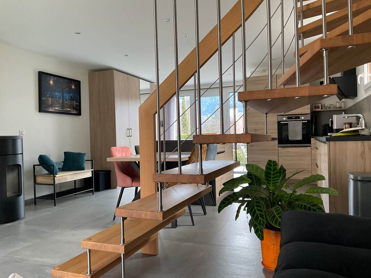 Dans un environnement calme et paisible, cette maison au pied de la montagne est à deux pas du lac, des commodités et de la piste cyclable Maison de 80m2, vous profiterez de son jardin, deux terrasses, plancha, table de ping-pong, internet/TV A l'étage, 3 chambres avec lit double, une salle de bain et un Wc séparé. Au rez de chaussée, une pièce à vivre d'environ 35m2, une salle de douche avec Wc, le canapé est convertible en lit de 140X190 Le lac est à 10min à pieds et la piste cyclable à 100m.