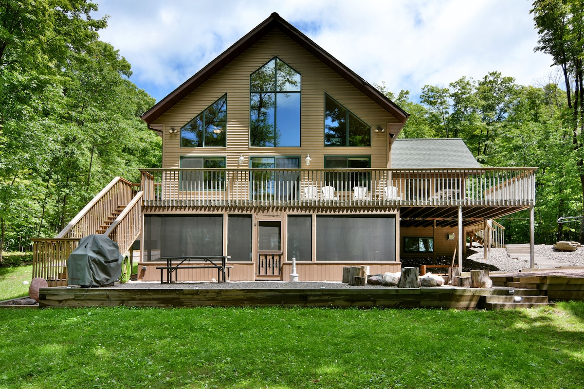 La maison de lac de style scandinave est en place pour votre détente privée. Entièrement peint et rafraîchi - maintenant ouvert pour les réservations d'été au bord du lac! Niché dans des bois et des eaux bucoliques et vastes à seulement 3 heures de Twin Cities/4 de Madison. Barnes, Wis., nagez sur notre quai (390 de front de mer privé), bateau sur le magnifique lac Middle Eau Claire, flânez sur les ruelles de la campagne, détendez-vous dans un confort moderne. Parcourez les kilomètres de sentiers à vélo. Wifi ultra-rapide (plus de 500 Mbit/s). Espace moderne et hygge. 2,4 acres rien que pour vous.