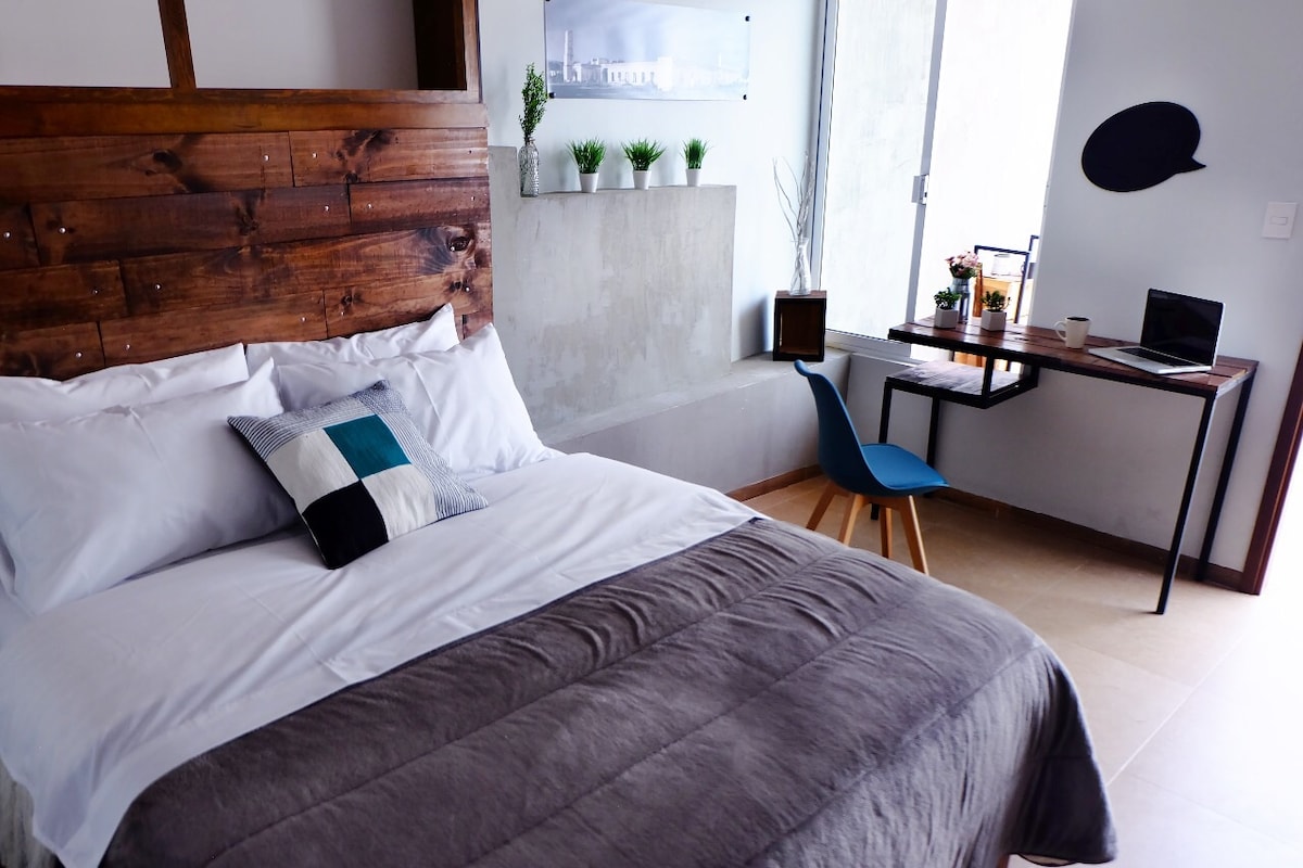 Chambre exécutive privée. Reposez-vous comme vous le méritez, à un prix qui convient✨. 🛏️ 2 lits doubles, salle de bain dans la chambre, linge de maison premium, télévision, Wi-Fi et minibar. ❄️ Minisplit pour une atmosphère conviviale. 🍳 Cuisine commune entièrement équipée. 🌿 Espaces verts. 🚗 Parking avec caméras. 🔐 Self check-in/out avec serrures numériques. ☕ Snacks disponibles. 🧺 Laverie équipée 📍 Face au parc, à proximité de la zone industrielle et des voies rapides. ✅ Qynd Hotel : l'option intelligente
