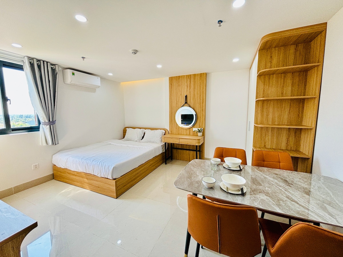 Une chambre studio comprend un très grand lit ou deux lits simples. Nous avons de nombreux studios de 33 à 36 m². Il y a 3 piscines, une plage privée, des restaurants, un spa, un espace pour enfants, etc. Vous avez accès aux piscines, mais vous ne pouvez pas utiliser le gym. Si vous voulez utiliser les serviettes aux piscines, vous devez payer un supplément de 80 000 vnd. Si vous voulez utiliser les chaises longues sur la plage, vous devrez peut-être acheter quelque chose (une boisson/un plat,...) là-bas. La vue sur la mer est garantie. Pour un séjour de 7 jours, on offre 1 nettoyage gratuit par semaine.