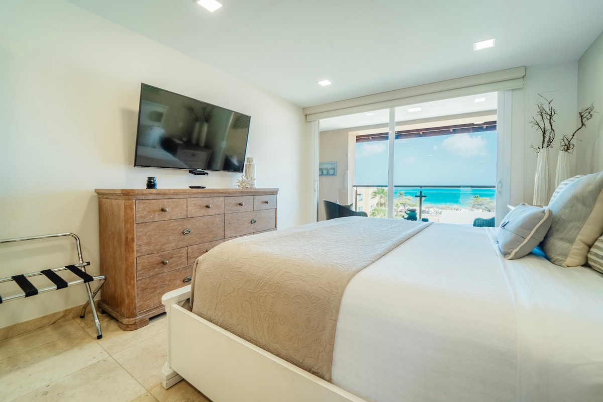 Vue imprenable sur l'océan, une chambre, 2 salles de bains complètes, 1 300 pieds carrés de surface habitable et de terrasse, entièrement équipé, Wi-Fi gratuit, téléphone, climatisation, coffre-fort, piscine, jacuzzi, salle de sport, sécurité 24 h/24, parking privé, atmosphère calme et relaxante. À seulement quelques pas de la meilleure plage de l'île et parmi les cinq meilleures du monde, l'incroyable « Eagle Beach », à proximité des restaurants et des supermarchés, quartier agréable et calme. Chaises de plage, serviettes et même une glacière fournies.