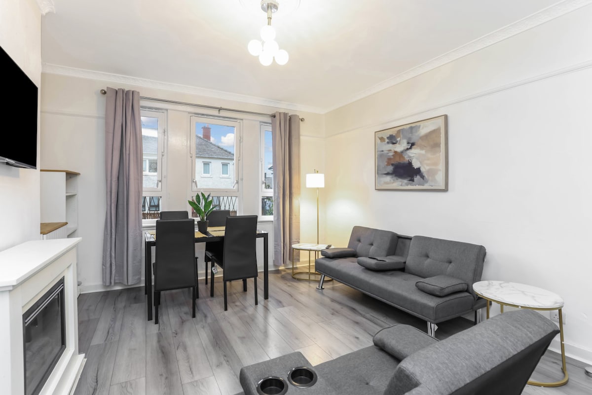 Bienvenue dans votre superbe escapade à Glasgow ! - 2 chambres magnifiquement décorées avec des lits confortables - Quartier animé à proximité de boutiques, bars et restaurants ; - À seulement 2 minutes de marche de la gare de Giffnock pour un accès facile à la ville - Salle de bain relaxante avec une belle baignoire pour un trempage paisible - Table à manger parfaite pour les rassemblements, pouvant accueillir jusqu'à 4 voyageurs - Abondance de parcs locaux, y compris Queen's Park pour le plaisir en plein air