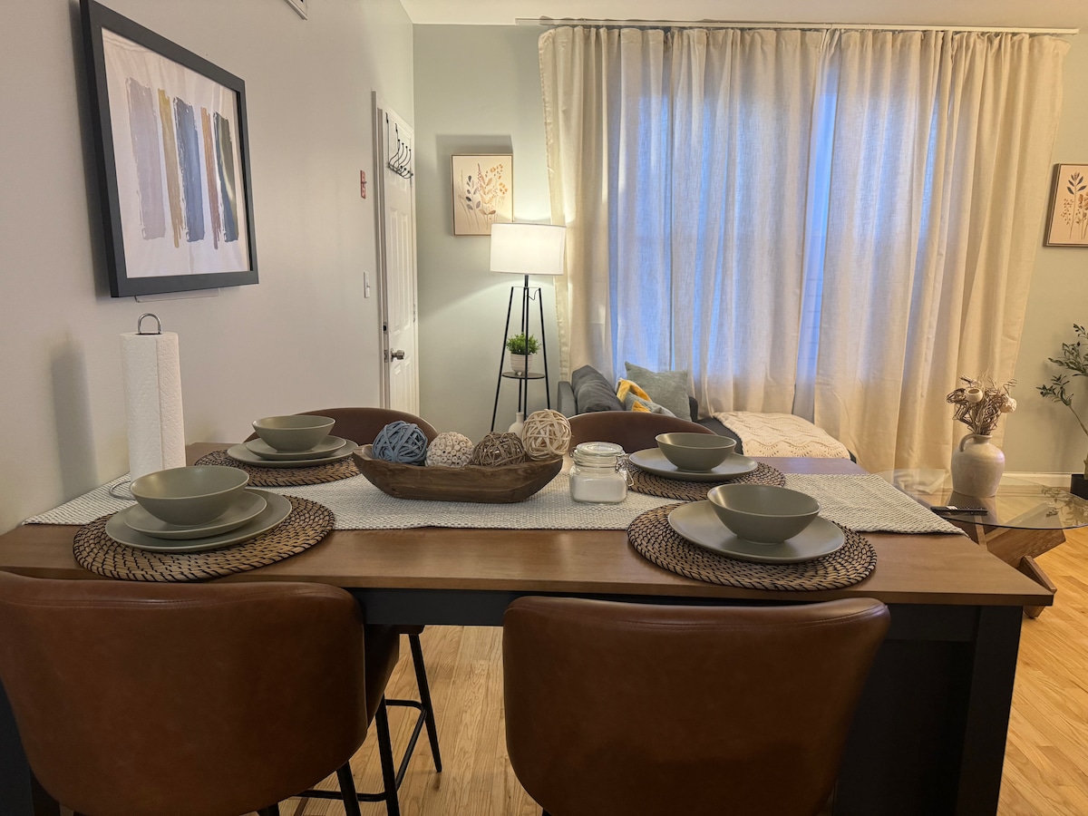 Bienvenue chez vous loin de chez vous ! Cet appartement lumineux et moderne est le séjour idéal que vous voyagiez en famille, que vous visitiez la ville pour le travail ou que vous recherchiez simplement une escapade paisible. Le logement est conçu pour le confort, avec des œuvres d'art murales de bon goût, un éclairage chaleureux et une touche accueillante pour que vous vous sentiez comme chez vous. Profitez d'une cuisine entièrement équipée avec tout ce dont vous avez besoin pour préparer des repas. Parfait pour les dîners en famille ou les repas rapides entre les réunions d'affaires.