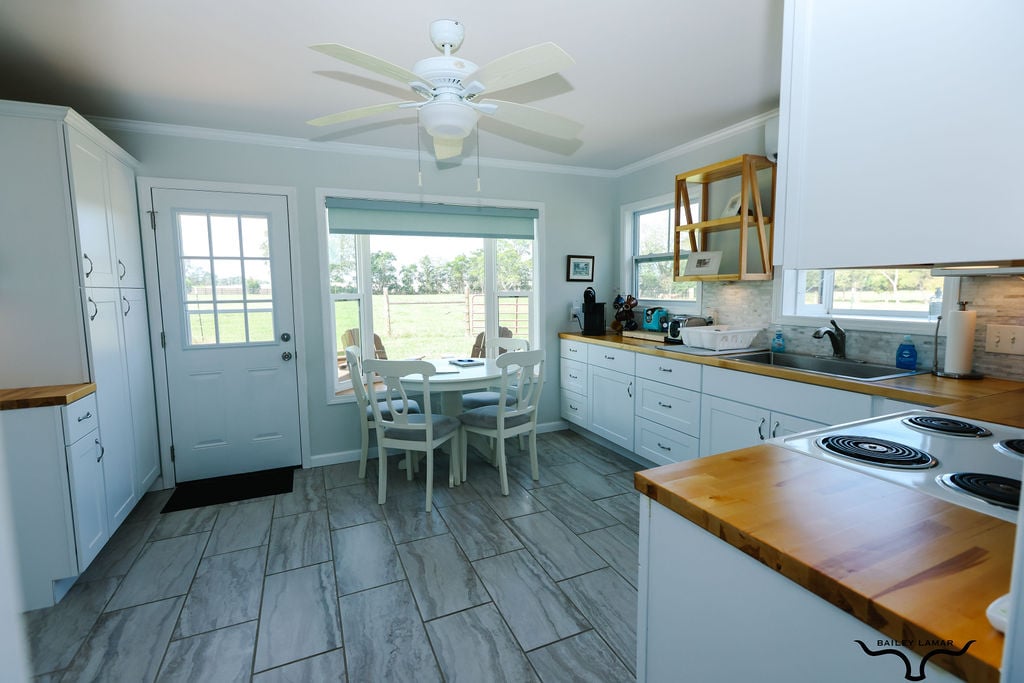 Venez ressentir la magie de notre maison d'hôtes de campagne rénovée. Il s'agit d'une salle de bain de 2 chambres et 2 salles de bain, avec une cuisine complète, une salle à manger et un salon. La chambre principale dispose d'un lit king et la 2e chambre peut accueillir 3 personnes avec un lit superposé XL double et un lit XL double séparé. La salle de bain principale dispose d'une luxueuse douche sans trottoir et d'une double vasque. La maison se trouve en bas d'une allée privée après avoir franchi un portail de sécurité. Les voyageurs ont accès à notre piscine creusée privée (piscines ouvertes), à notre barbecue, à notre foyer, à nos 40 acres et à nos 2 étangs de pêche.