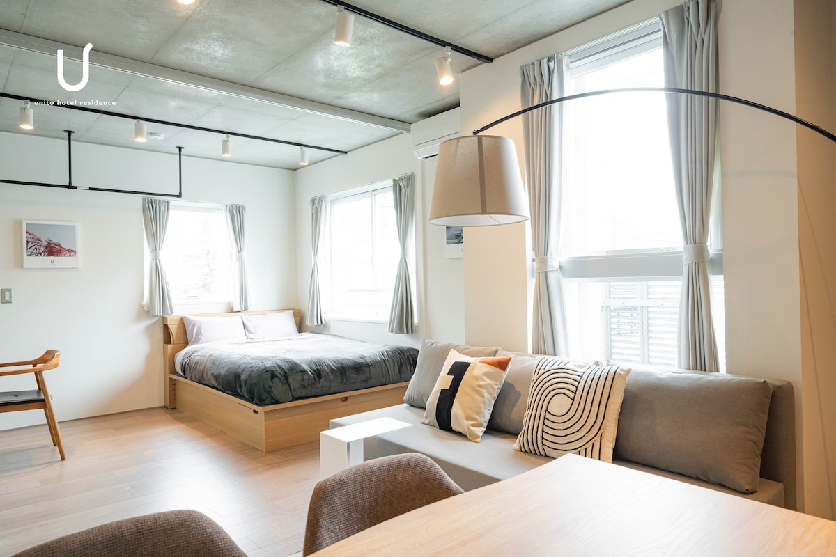Un loft serein et minimaliste à seulement un arrêt de Shibuya et Roppongi, parfait pour les voyageurs en solo ou le travail à distance. Avec une connexion Wi-Fi rapide, une chaise Aeron et un lit double compact (150×210 cm) - idéal pour une personne, confortable pour deux. La salle de bain en verre et les murs en béton élégants lui donnent un côté moderne (remarque : il y a un peu de condensation en hiver, il suffit de faire fonctionner le ventilateur de la salle de bain). Il n'y a pas de placard, mais il y a de la place pour quatre grandes valises et il y a une tringle et dix crochets pour garder les choses bien rangées.