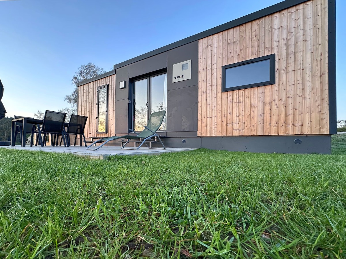 Confortable 24 m ² Tiny House avec 4 places de couchage, 2 chauffages électriques, poêle à bois et grande salle de bain. Télévision par satellite, Wi-Fi + très bonne réception du téléphone portable. Sauna électrique en forme de tonneau à usage exclusif, grande prairie avec arbres fruitiers, foyer et belle vue avec chaises longues. Places de parking en gravier. Pour se baigner, le lac Silbersee est à 2,5 km et le lac Perlsee avec sa brasserie de plein air à 13 km. C'est très calme au bout d'un hameau. Vous êtes dans le jardin pour vous seul.