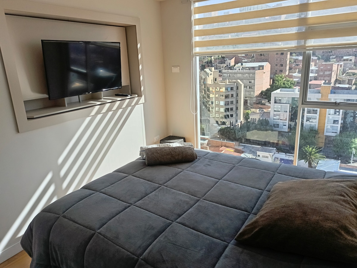 Nouvel appartement, spacieux, situé à un étage élevé et très lumineux. Idéal pour les voyages de repos ou de travail. Il dispose d'une chambre avec dressing, de deux salles de bains complètes, d'une cuisine équipée et d'un grand salon avec de belles vues. Situé dans un quartier sûr, à proximité de cafés, de restaurants et de supermarchés, avec une excellente connexion aux transports en commun. Si vous préférez marcher, c'est parfait pour vous déplacer facilement. Profitez de La Paz avec confort, style et chaleur. Votre espace confortable vous attend!
