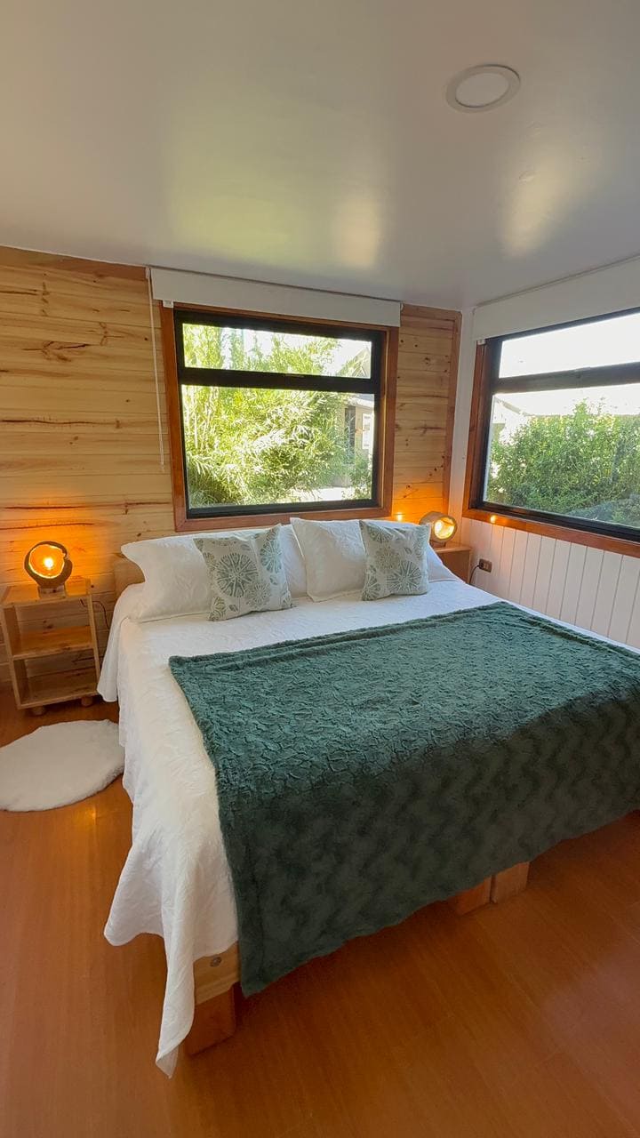 Belle cabane -Martin Pescador- en bois de 55 m² avec 2 chambres, une avec un lit double de 2 places et une autre avec un lit d'une place et demie plus un lit gigogne d'une place. Chauffage avec radiateur électrique et chauffage supplémentaire à granulés central. Grande salle de bain avec lave-linge inclus. Cuisine équipée et réfrigérateur. Excellente construction avec isolation thermique, plancher en bois et toutes les fenêtres en panneau thermique. Possibilité d'un excellent petit déjeuner pour 7 500 pesos chiliens p/p.