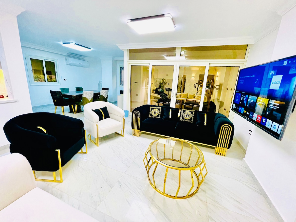Oasis lumineuse près de l'aéroport international du Caire Situé à quelques minutes de l'aéroport dans l'un des quartiers les plus sûrs du Caire, cet appartement au dernier étage offre la tranquillité d'esprit. Bien qu'il n'y ait pas d'ascenseur jusqu'au 4e étage, la montée en vaut la peine pour la vue imprenable sur le toit et l'ambiance calme. L'appartement est entièrement équipé pour votre confort, avec une télévision intelligente 4K avec Netflix et Amazon Prime.