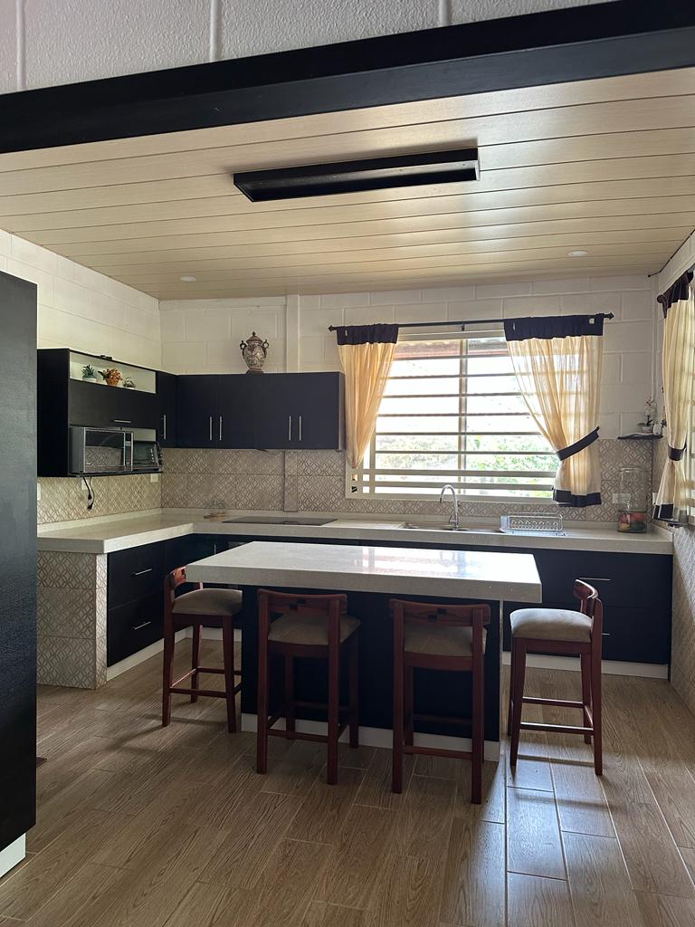 Logement de 3 chambres avec climatisation et salle de bain privée, chacune avec lit double et lit simple, capacité pour 9 personnes; salon privé, cuisine-salle à manger et salle de bain sociale; pour un plus grand nombre d'invités, une chambre attenante avec salle de bain privée, ventilateur, 1 lit double et 2 lits simples; total 13 invités. Commodités : Piscine de 6x2x1m, barbecue, salle à manger extérieure avec télévision et garage pour 3 véhicules.