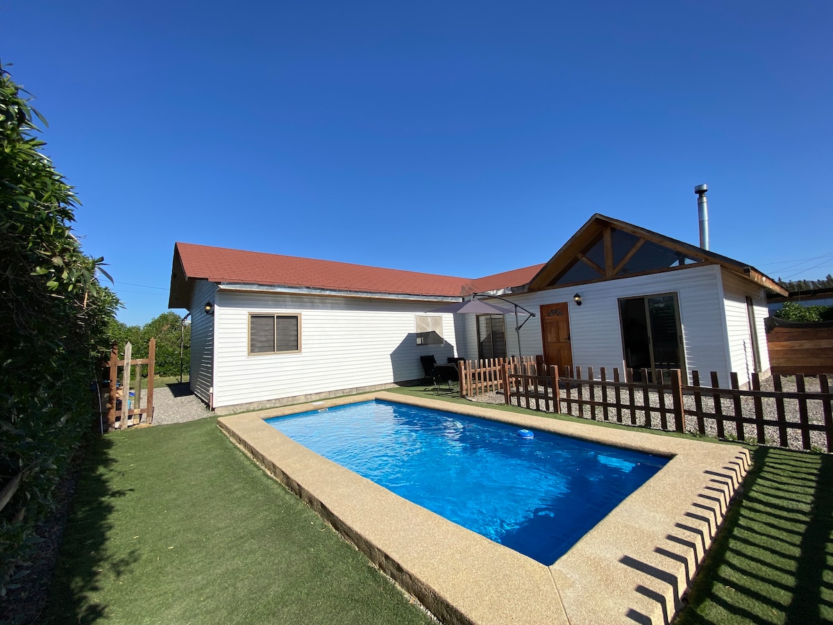 Descansa y reconecta con tu familia en un refugio tranquilo y acogedor. Este lugar es ideal para escapar del ruido de la ciudad y disfrutar de aire fresco. Nuestro espacio está equipado para el relajo. Puedes refrescarte en la piscina, o relajarte por completo en la tinaja de agua caliente (con un costo extra). Los más pequeños se divertirán en la cama elástica, mientras preparas una deliciosa parrillada. El lugar es cómodo para familias de entre 4 a 9 personas, aunque podemos alojar hasta 15.