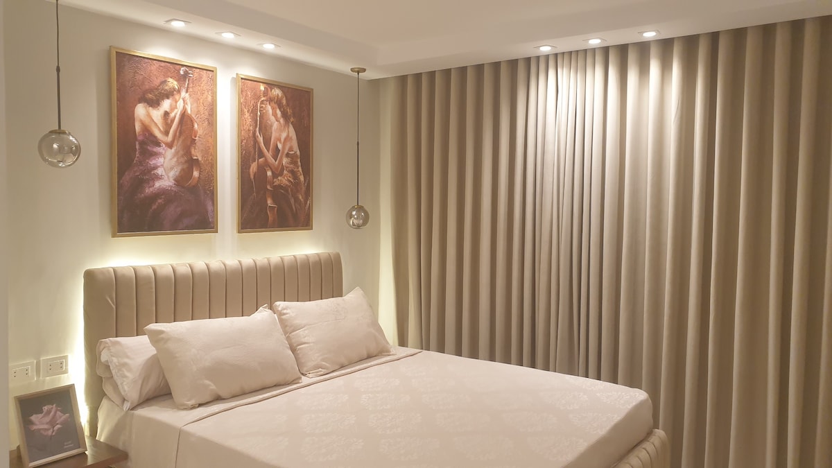 Essayez des vacances relaxantes dans un grand appartement avec 2 chambres (lit king size et 2 lits simples) et 2 salles de bains, l'une d'elles grande avec une baignoire à eau chaude, et aussi un grand salon avec une télévision Samsung intelligente, une table à manger, une grande cuisine et toutes les commodités dont vous avez besoin avec une vue magnifique sur le jardin paysager avec un parking gratuit toute la journée et un ascenseur pour l'unité, des jeux de cartes également fournis, à 3 minutes à pied, vous trouverez toute la rue avec des restaurants, des cafés, des magasins de boissons Profitez-en ici.