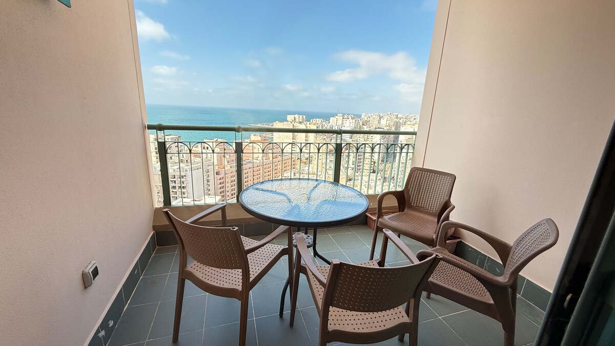 Appartement de 3 chambres avec vue sur la mer et sur le palais de la princesse Aziza Fahmy. L'appartement est entièrement meublé, climatisé et dispose de tous les équipements nécessaires, cuisine complète, Wifi, Smart TV avec Netflix, draps, couvertures et serviettes. L'appartement se trouve à moins de 10 minutes à pied de Gleem Bay et du centre commercial San Stefano qui comprend des magasins, des restaurants, un cinéma et des aires de jeux pour enfants.