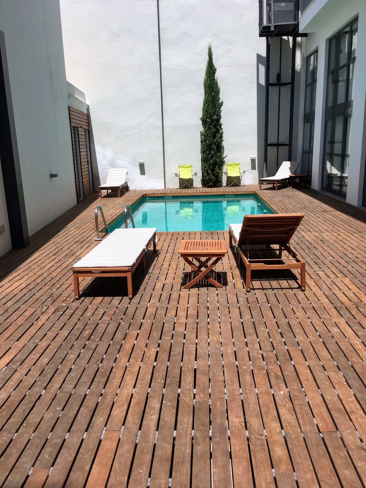 Duplex moderne avec piscine dans le centre historique. Capacité pour six personnes. Au rez-de-chaussée, salon-salle à manger avec cuisine intégrée et accès au patio où se trouve la piscine (partagée entre cinq étages), une chambre indépendante et une salle de bains complète. Au dernier étage, une chambre indépendante, une salle de bains complète et un espace de type loft ouvert avec des fenêtres donnant sur la rue et qui survole la cuisine avec vue sur la piscine où il y a un lit double à côté d'une table de travail.