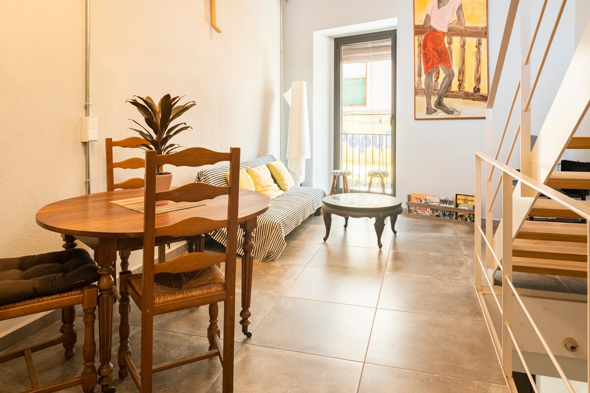 Charmant loft très central et à 10 minutes à pied de la plage. À proximité des bars, restaurants, magasins et supermarchés. Vous n'avez besoin de la voiture pour rien. Arrêt de bus à 5 minutes et gare à 10. Il est idéal pour un couple. Il dispose d'une terrasse fraîche le soir et calme, d'un espace de travail, d'une chambre avec lit double ainsi que d'un salon-salle à manger avec cuisine ouverte.