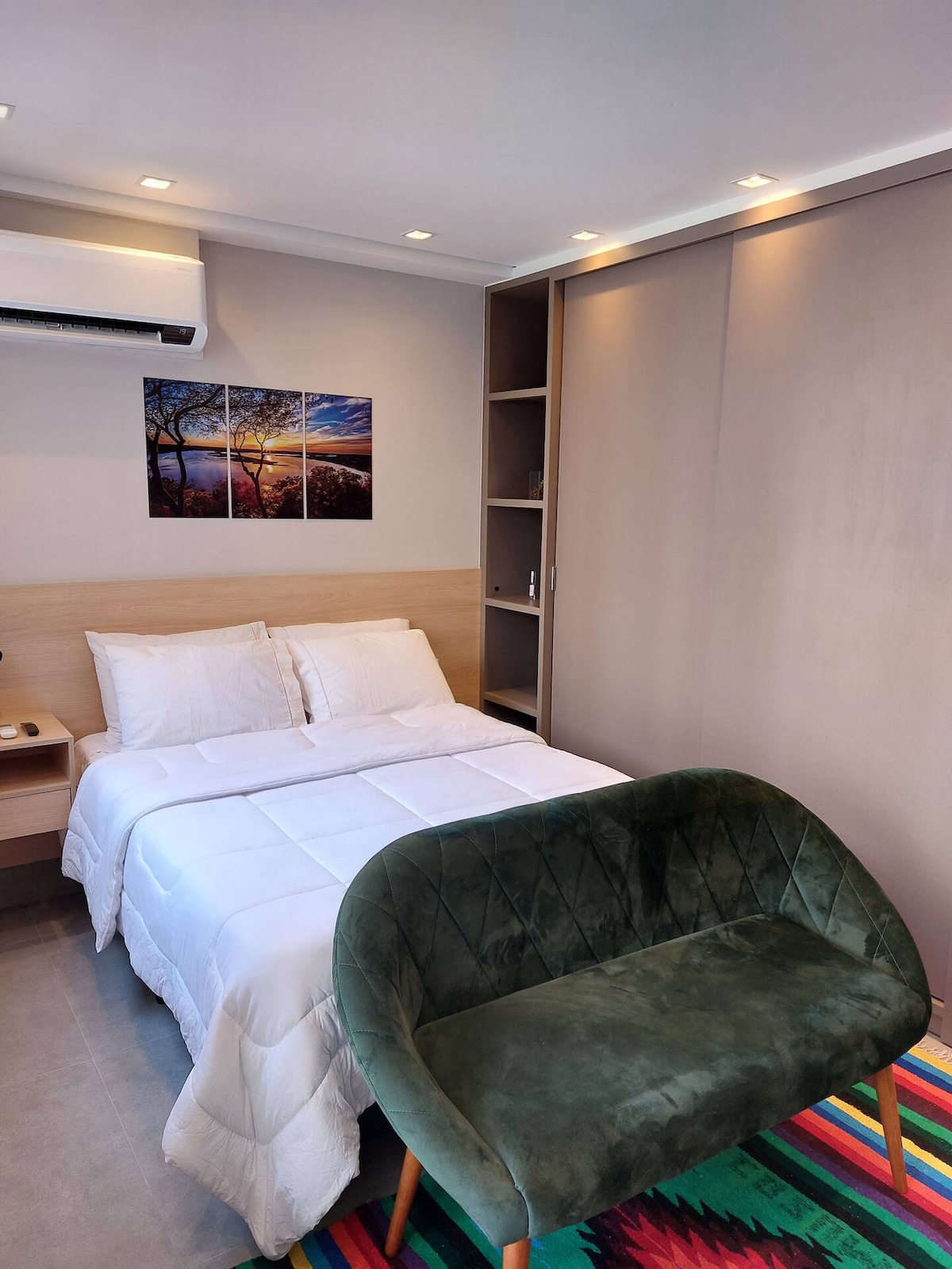 Loft Studio de 40 m² conçu et complet pour un séjour confortable, avec un service de conciergerie à la réception et toutes les facilités et commodités d'un appartement. Le plus grand étage de la copropriété (40m2) à l'étage. Loisirs complets, salle de sport, jacuzzi, sauna, piscine, espace bureau, supérette, parking inclus dans le prix, buanderie et internet (dans l'appartement et dans tous les espaces communs). Bon emplacement à proximité des entreprises, des espaces événementiels et du métro (stations Alto da Boa Vista et Adolfo Pinheiro).