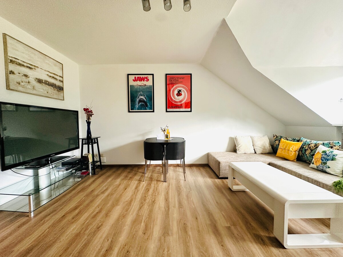 Appartement non-fumeur confortablement meublé (64 m²) pour jusqu'à 4 personnes au rez-de-chaussée pour les couples, les familles ou les voyageurs d'affaires. La terrasse commune avec un grand espace extérieur vous invite à passer des soirées agréables avec barbecue et cheminée.