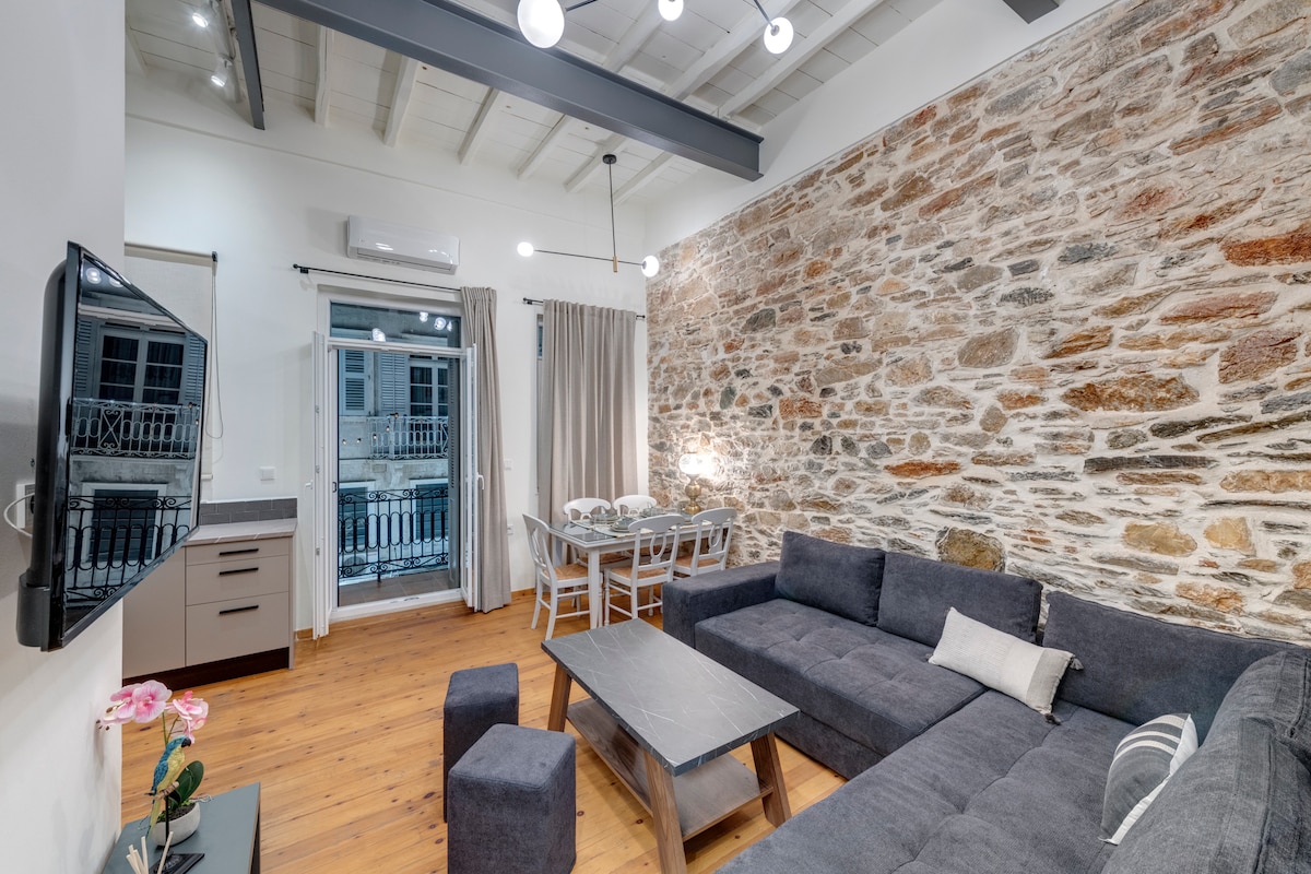 Suite with 160sqm garden at the center of Hermoupolis. Newly built with exceptional furniture. The apartment is located 3 minutes walking from the church of Agios Nikolaos , 5 minutes walking from Apollon Theatre and 7 minutes walking from the Main Square (City Center). The suite has a unique 120 meter shared beautiful garden. Just a few minutes away from the entrance of the famous Asteria Beach and Syros famous Vaporia area (Little Venice)