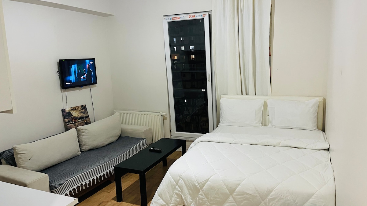 Enjoy a stylish experience in this centrally located apartment. Our apartment can accommodate 3 people with 1 queen bed and a sofa bed that can be converted to bed. Wi-Fi/Smart TV (you can watch movies for free with an active Amazon Prime account). Indoor parking is available. It has a clear view of the city.14 minutes from TUYAP congress by car. there is many materials at kitchen. The location is central, with many markets, cafes, restaurants, shopping malls, hospitals, and bus stops nearby.