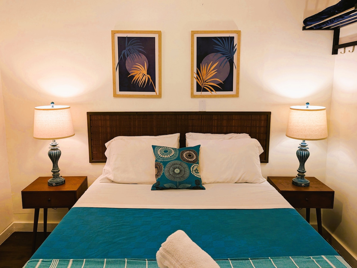 Nos chambres avec grand lit sont des retraites économiques et climatisées, parfaitement dimensionnées pour les couples. Cette chambre confortable dispose d'un lit queen-size confortable et d'une salle de bains attenante compacte, conçue avec soin pour plus de commodité. Complet avec des serviettes régulières et de plage et une connexion Wi-Fi gratuite, ils offrent tout ce dont vous avez besoin pour un séjour confortable et agréable. Cette chambre est proche du bord de l'eau et est située juste derrière le Lazy Jacks Pub