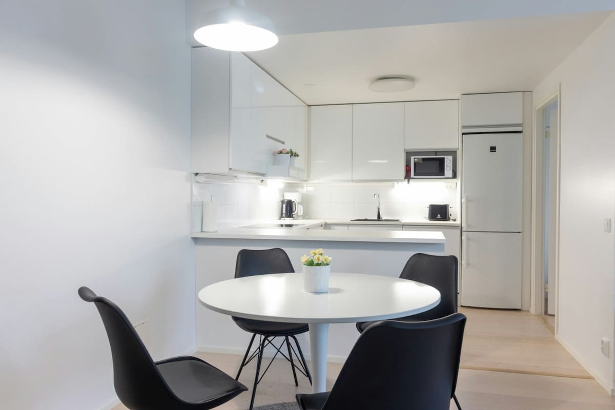 Ce studio de travail spécial pour deux, situé au cœur de Lauttasaari, est un endroit confortable pour une escapade longue ou courte, et est le mieux adapté à vos besoins de voyage d'affaires en incluant une connexion Wi-Fi gratuite, une table réglable en hauteur et une chaise de bureau ergonomique. Les confortables lits simples de 90 cm, un petit canapé et une table à manger. La cuisine est entièrement équipée et comprend un réfrigérateur, un congélateur, un micro-ondes, une cafetière, une bouilloire, un grille-pain et un ensemble complet de plats, couverts et ustensiles de cuisine.