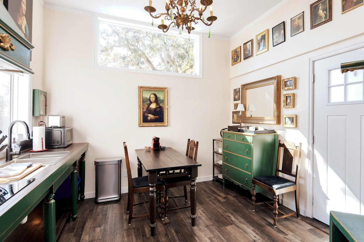 Cette suite peut accueillir de 1 à 4 personnes : 1 000 pieds carrés avec entrée privée. Séjour avec télévision connectée UHD de 49'. Coin repas avec quatre places assises. Cuisine entièrement équipée avec cuisinière, réfrigérateur, micro-ondes, grille-pain, bouilloire et cafetière. La salle de bain dispose d'une douche dans la baignoire, de toilettes et d'un lavabo. Il s'agit d'une suite en bas avec beaucoup de hauteur, sauf si vous êtes extrêmement grand. Du sol au plafond il y a 6 pieds 9 3/4 pouces, où une poutre de soutien traverse le plafond où la hauteur libre est de 6 pieds 2 pouces.
