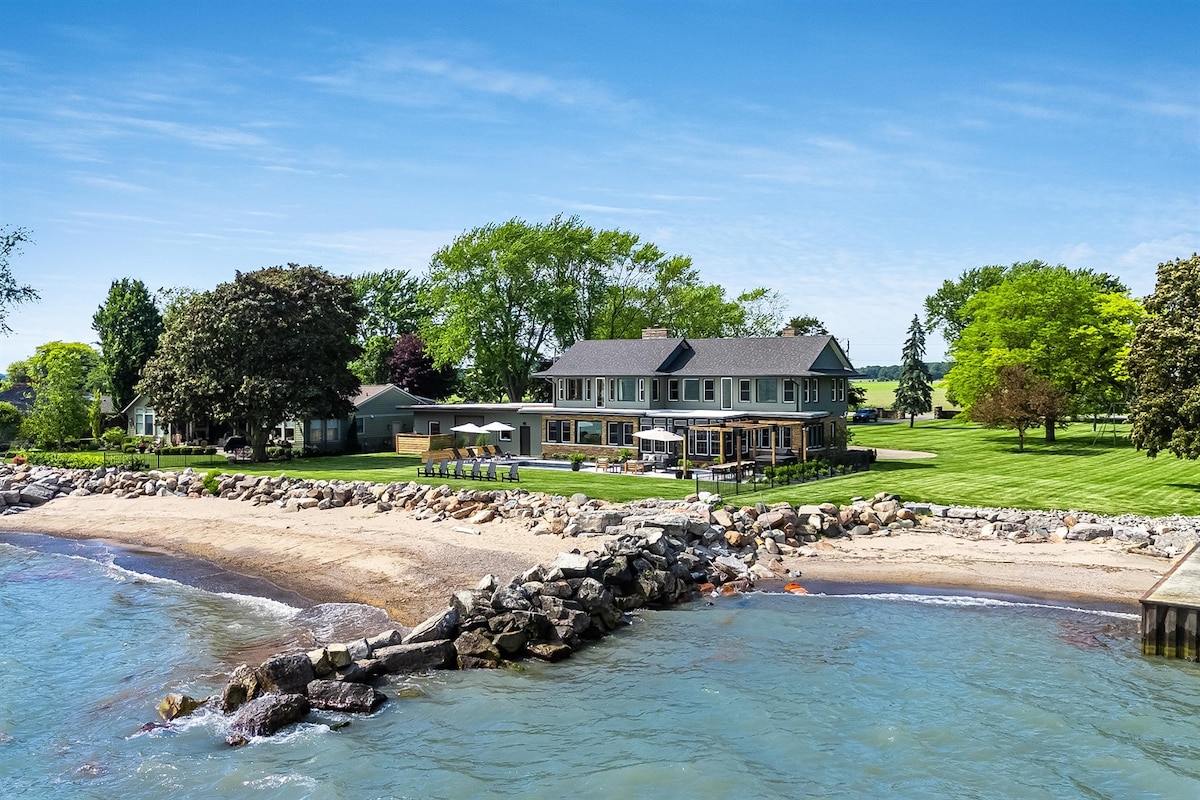 La North Shore Beach House est une retraite de luxe avec 190 pieds de rivage privé du lac Érié. Des vues panoramiques encadrent le grand salon, la véranda et la table de salle à manger en bois. Une cuisine gastronomique avec des appareils haut de gamme rend la réception facile. Quatre chambres, dont deux suites avec un très grand lit, une chambre avec lits superposés et une chambre confortable avec une banquette-lit, garantissent des nuits reposantes. À l'extérieur, profitez de la piscine d'eau salée, du spa et du foyer. Au cœur de la région viticole de la rive nord du lac Érié.