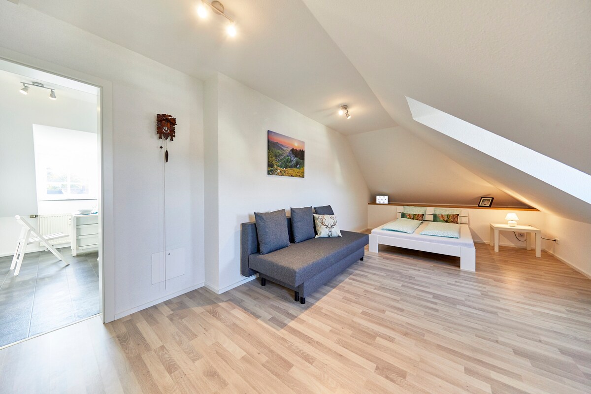 L'appartement de 538 pieds carrés construit en 2019 est situé au-dessus du garage de la maison de notre architecte dans un quartier résidentiel calme à 11 km d'Europapark. Il dispose d'une entrée indépendante et se compose d'une chambre spacieuse avec lit double box-spring (2 m x 2 m), d'un canapé et d'un coin repas avec vue imprenable sur la nature (biotope). Vous y trouverez également une cuisine entiÚrement équipée et une salle de bains avec douche à l'italienne. Wi-Fi et TV à disposition. De plus, il y a une place de parking séparée.