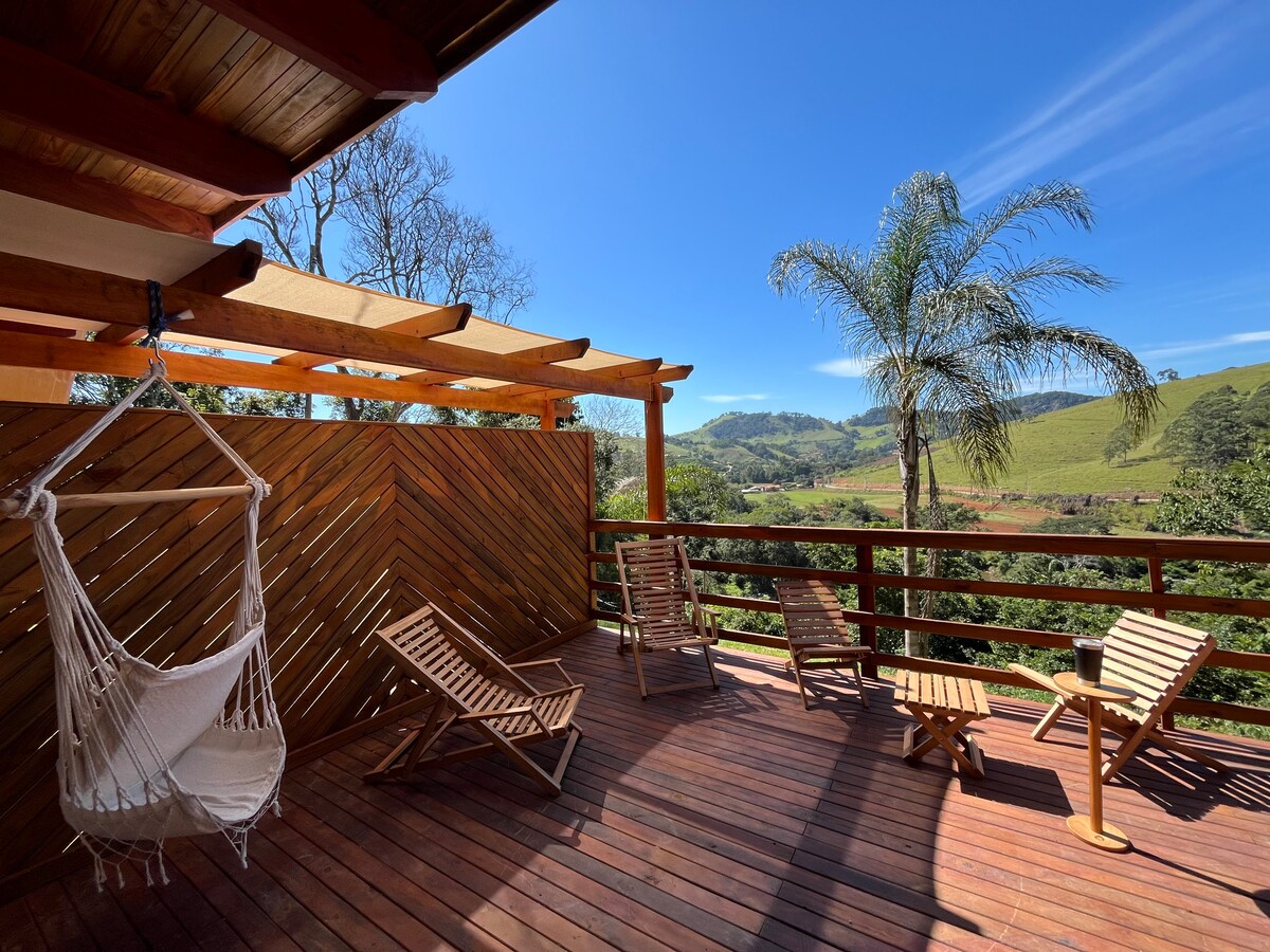 Réveillez-vous au chant des oiseaux, détendez-vous dans un spa et savourez un verre de vin en contemplant les montagnes au clair de lune. Notre chalet est l'escapade idéale pour les couples qui recherchent la connexion, le confort et la nature : Superbe vue sur les montagnes Foyer extérieur, Ciel étoilé, sentiers et nature luxuriante Lit queen size, cuisine complète, Wi-Fi et télévision dans la chambre Le logement a aussi un lac Nous sommes à côté de l'hôtel Ponto de Luz À seulement 15 km de la ville,